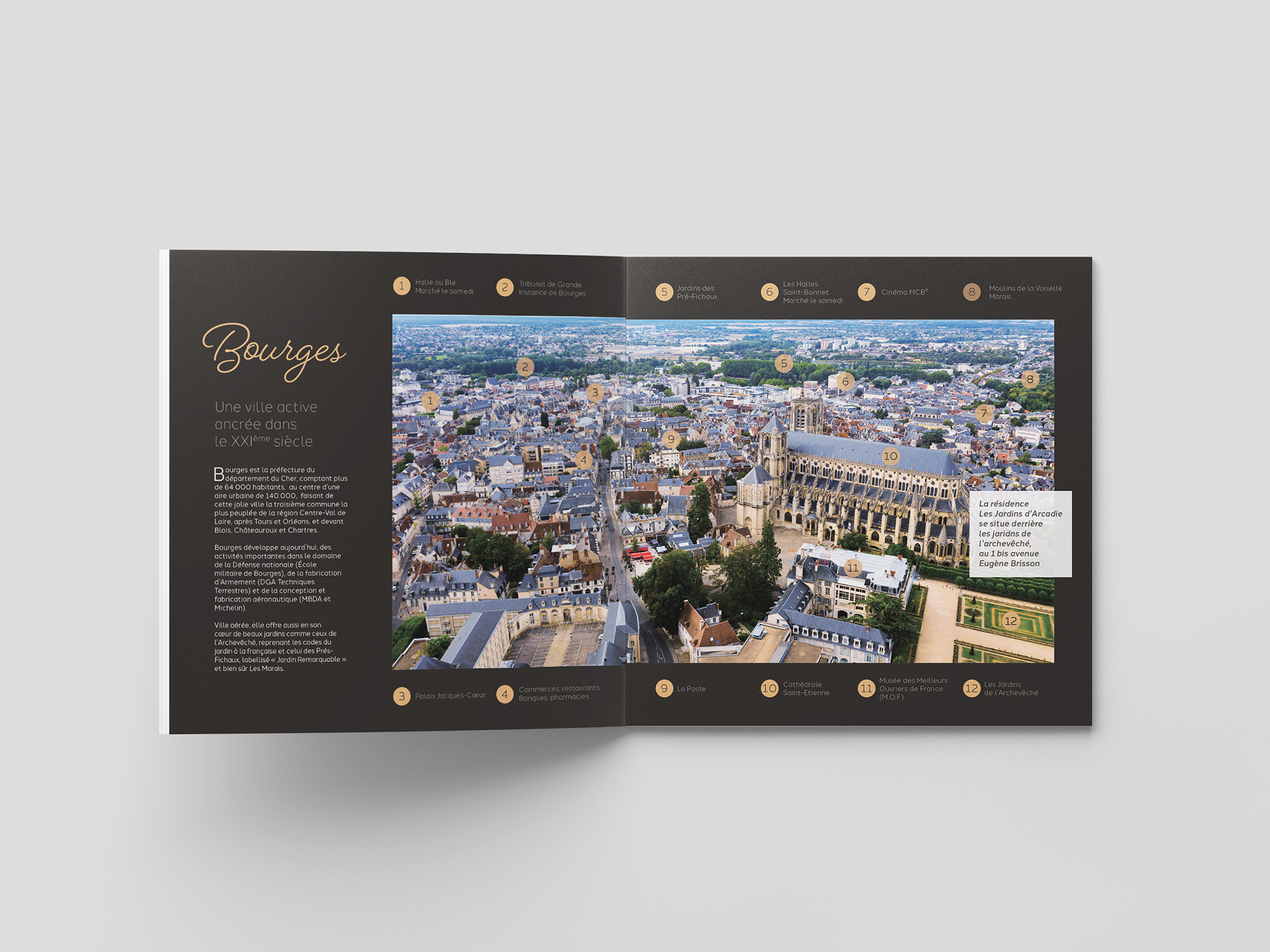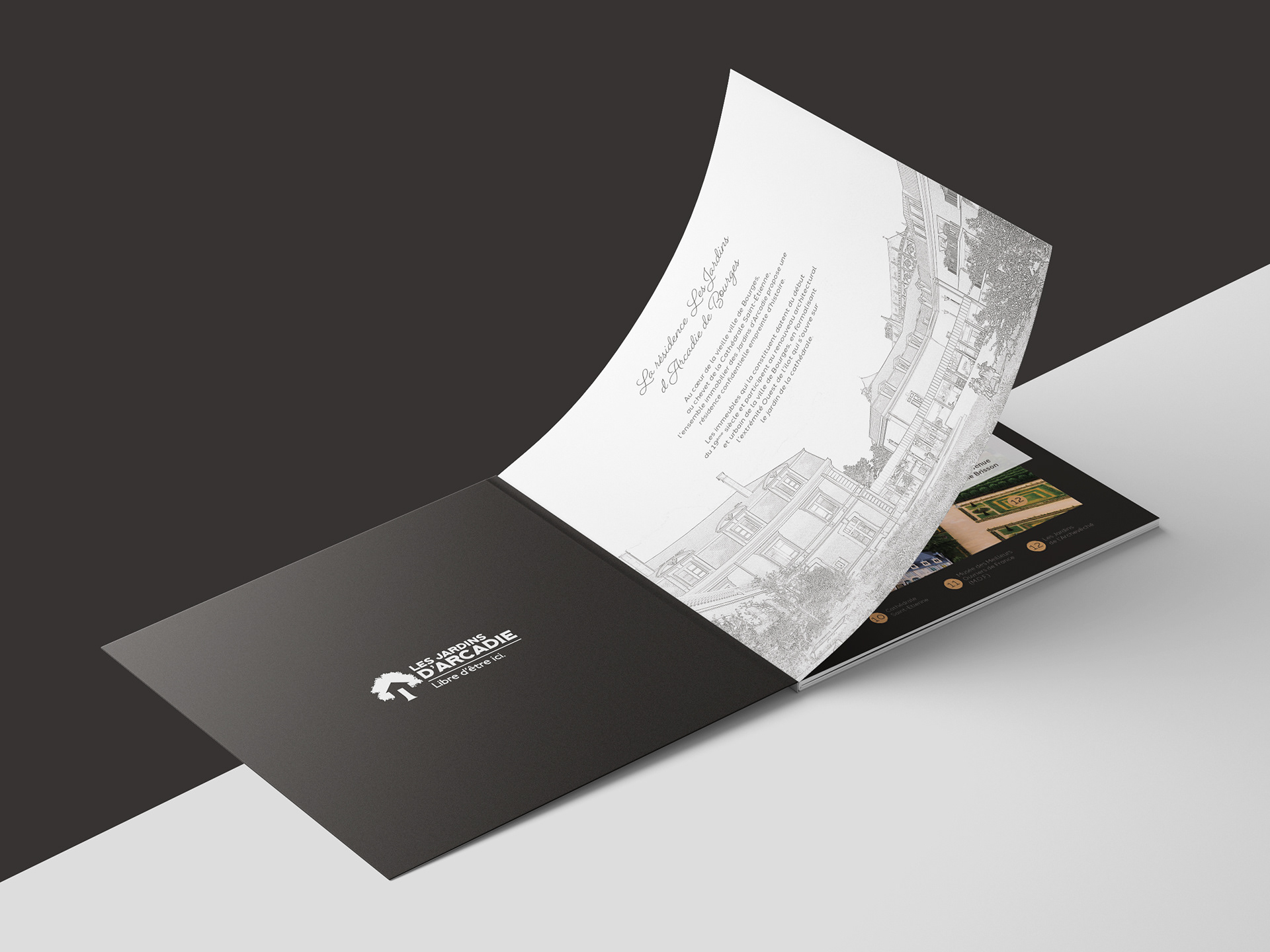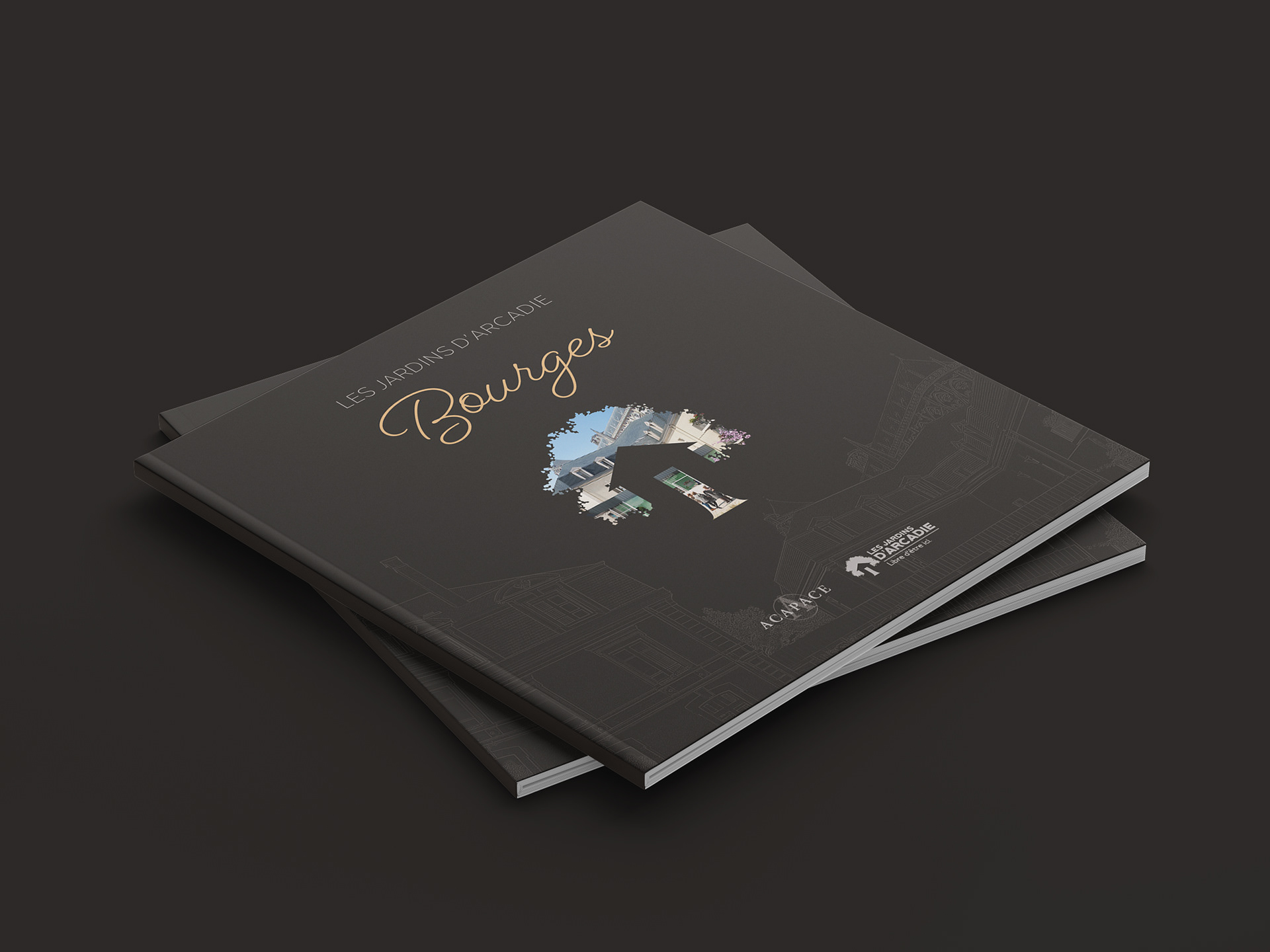 Réalisation d'une plaquette promotionnelle pour des investissements immobiliers à Bourges pour Les Jardins d'Arcadie, groupe ACAPACE (2018-2023).
